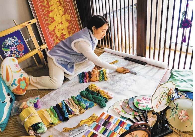 2024年,曾是游戏原画设计师的刘晓燕,毅然回到家乡房山区周口店镇良各庄村。她下定决心创办京绣工坊,一是源于自儿时起便深埋心底、从求学到工作始终未曾放下的京绣情怀;二是心疼儿时伙伴大多赋闲在家,盼为她们寻一条家门口的增收路;更因家乡周口店龙骨山上出土的骨针文化,让她深感肩负着传承指尖技艺、延续千年文脉的使命。